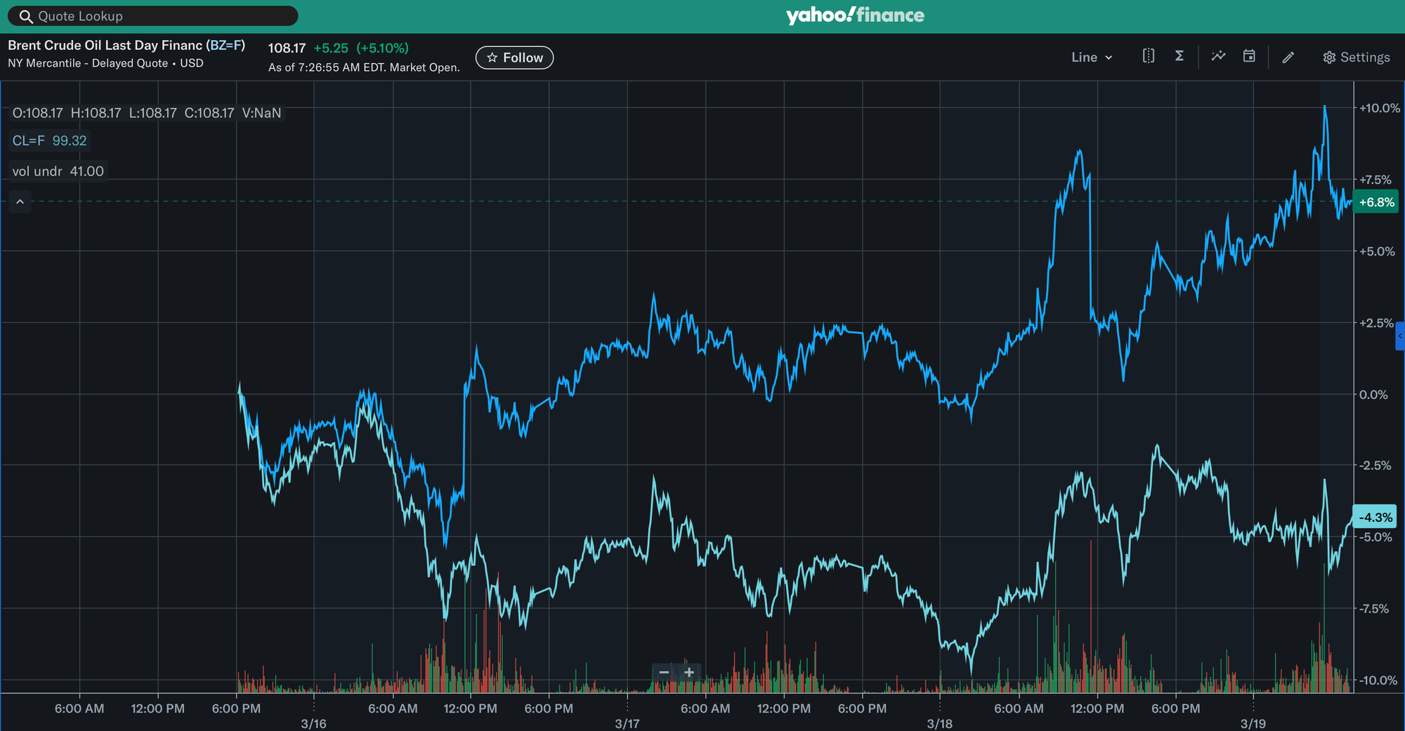 Brent, WTI: +6.48% ($114.34; crossed $119 overnight) / +1.29% ($97.57)
